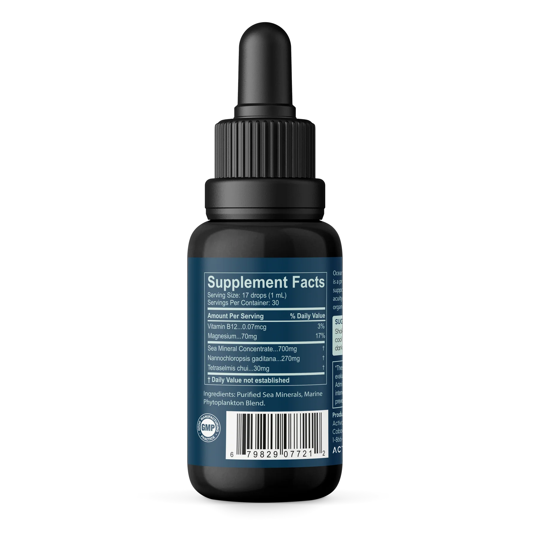 12 gouttes contiennent 34 mg de magnésium, 336 mg de minéraux marins, 130 mg d'algue Nannochloropsis Gaditana et 14 mg de phytoplancton Tetraselmis.